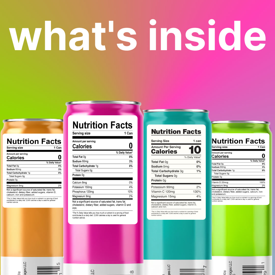 Four drinks for different parts of the day. Need a little morning pick-me-up? Enjoy Melon Berry with a touch of caffeine. Feeling a little under the weather? Enjoy Orange Mango Turmeric for an immunity boost. Inside working all day? Try Peach Pineapple for a kick of Vitamin D. Heading to the gym later? Enjoy Watermelon Lemon-lime to quickly rehydrate. All enhaced water with 0 sugar and 0 calories.