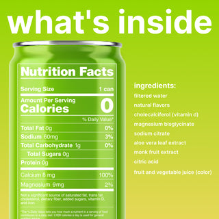 filtered water, natural flavors, cholecalciferol (vitamin d), magnesium bisglycinate, sodium citrate, aloe vera leaf extract, monk fruit extract, citric acid, fruit and vegetable juice (color).