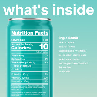 filtered water, natural flavors, ascorbic acid (vitamin c), magnesium bisglycinate, potassium citrate, ashwagandha root extract, l-theanine, citric acid